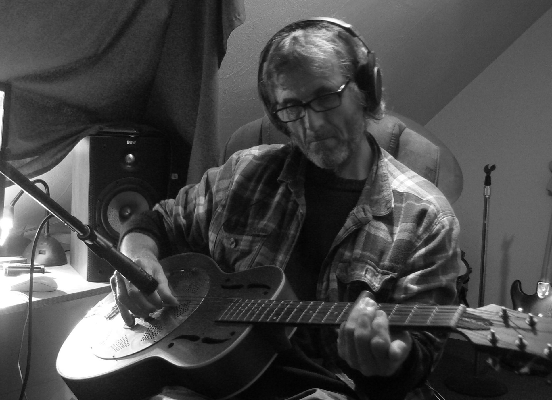 Long ago, when music venues, grand hotels, and pubs welcomed both rock music and leather-clad customers, Steve Allan played electric guitar in rock bands in the North-East of Scotland. After a while he retreated to Downies, a temporary slave to capitalism, but remained uncannily committed to his deep relationship with music - writing and recording from his fisherman's cottage. Expanding his tech skills - he now blends these with the haunting sounds from a wide range of acoustic instruments, and folk-ish low-D whistle, producing folk/rock tracks as Yorlum, and more recently as The Honey Barrel Blues Band.